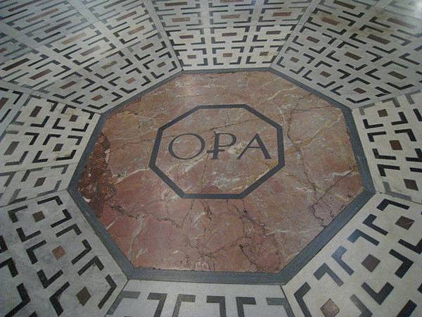 在義大利幾個著名的大教堂(尤其是佛羅倫斯/西恩納一帶)皆可見到這個明顯的OPA標誌, 回來後好奇地查了一下, 才知道OPA是個古老組織的縮寫, 其歷史可以追朔自西元1180年至今, 擁有廣大的地產, 現今為一非營利組織, 依舊管理著義大利著名的幾個大教堂, 有興趣了解的可以參觀一下OPA的官網