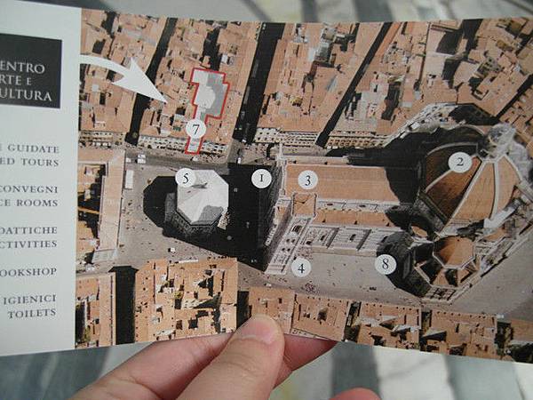 結束參觀後別忘了一件很重要的事! 1是聖母百花大教堂, 4是喬托鐘樓, 5是八角形洗禮堂, 7是洗手間所在位置, 離開前可以好好利用一下!