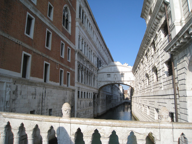 嘆息橋的兩端連接法院與監獄, 相傳囚犯通過此橋時, 透過橋上的小窗得以瞥見外面的世界最後一眼, 並禁不住為自己將永不見天日的遭遇而嘆息, 而被稱作嘆息橋Ponte dei Sospiri. 因為實在太有名了, 後來其他國家許多仿造它的橋樑也都取名為嘆息橋, 共同點都是密閉式的拱橋, 想不到我一個月後就又相繼造訪了英國劍橋與牛津的嘆息橋, 也算滿Lucky的呢!