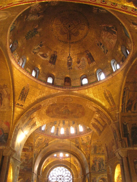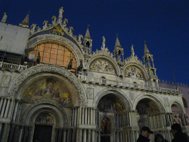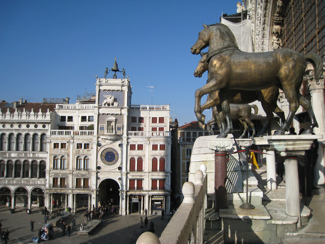 正門上方的四匹銅馬也小有故事, 據說是十字軍東征時從君士坦丁堡帶回的戰利品, 後來被拿破崙搶到法國, 放在羅浮宮旁小凱旋門上頭, 直到19世紀才又被送回威尼斯, 但現今小凱旋門跟聖馬可大教堂門上風吹雨打的都是複製品, 真品展示在教堂內部, 我們有參觀, 但不知為何又不給照相, 只好拍拍仿品
