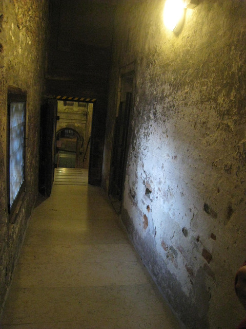 空蕩蕩的地牢很密實地被隔成一間間小隔間, 空無一物還是給人背脊發涼的感覺, 我們就沒有拍照, 從地牢回總督宮的方向, 窗戶望出去就是運河出海口, 也就是剛才我跟Joy拍打啵兒照的地方