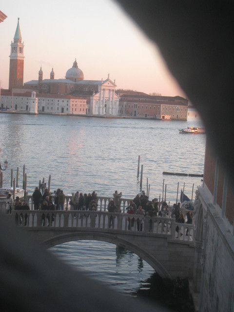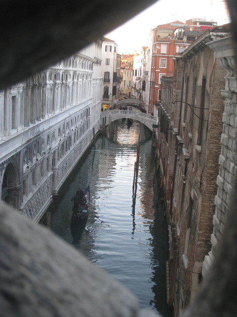 從總督宮往地牢的方向, 窗戶望出去是運河內部, 剛好有一艘貢多拉經過, 不知道他們經過橋底有沒有接吻呢?