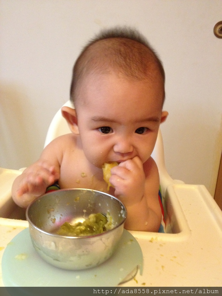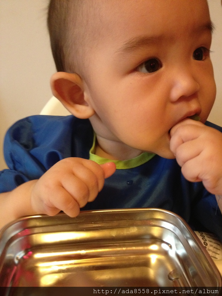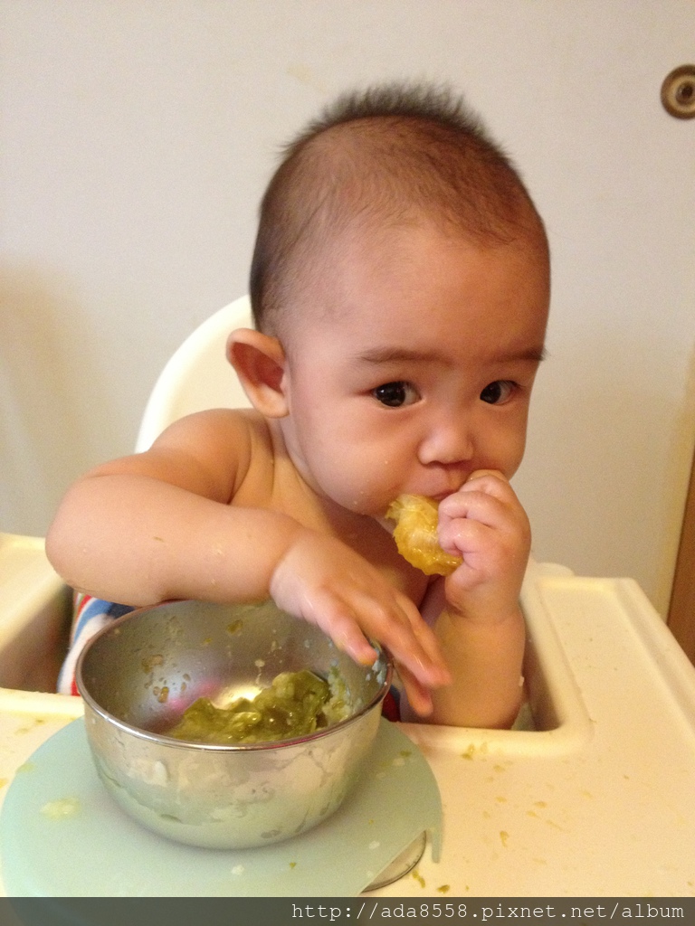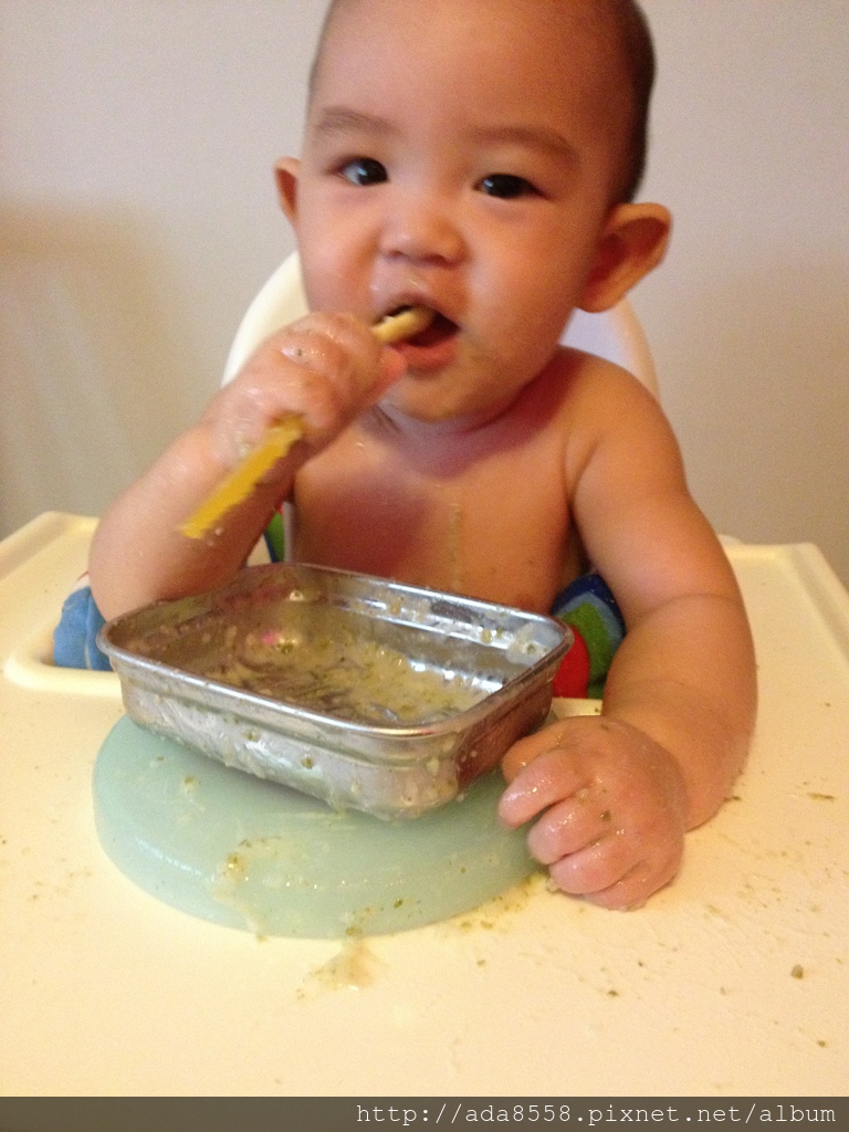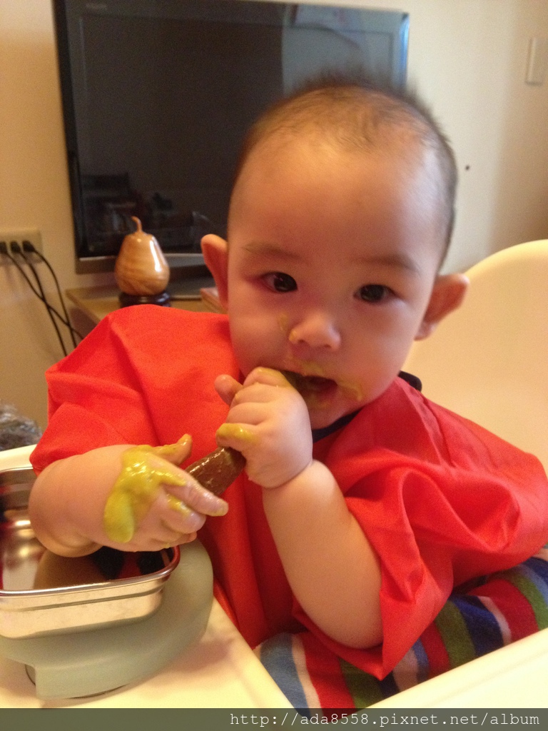而且他是個很好摸透的孩子, 如果他想吃時, 一拿到湯匙就會迫不及待地放嘴巴, 不想吃時才會開始拿湯匙敲打桌子, 這時我通常就會抓他去清洗, 結束用餐(同時也是讓他知道想吃就要好好吃)