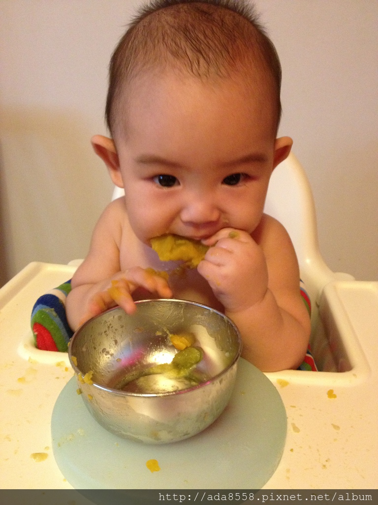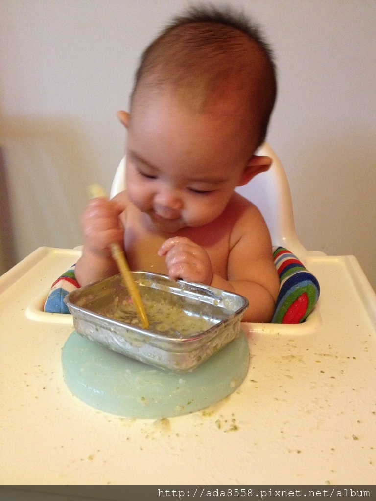 說到這兒, 先來獻寶一下: 小芋圓剛滿7M時就會接過媽咪幫他盛好的湯匙放進嘴裡吃
