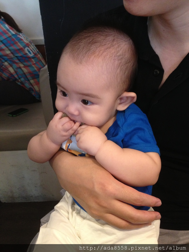 長出2顆牙的小芋圓吃東西的技巧進步很神速, 不知道是不是因為經常啃咬的關係, 滿8M沒多久上排牙齒還一口氣冒出4顆(辛苦小芋圓了)