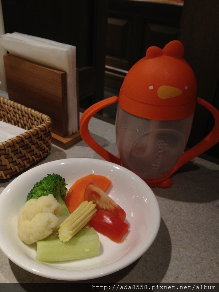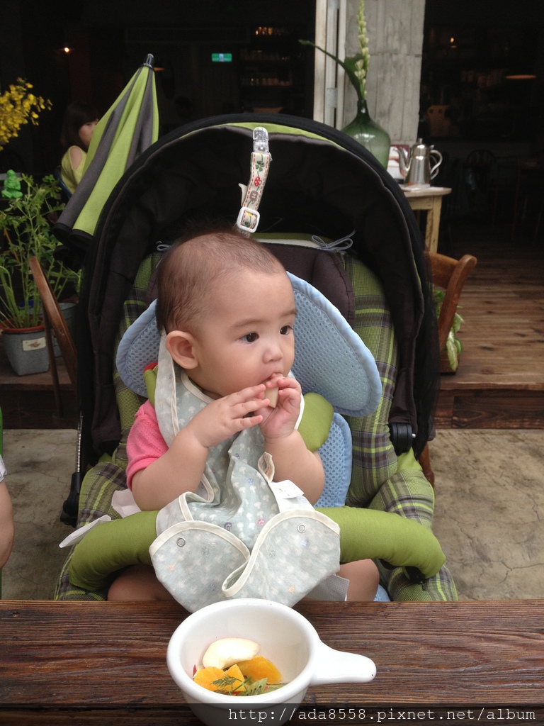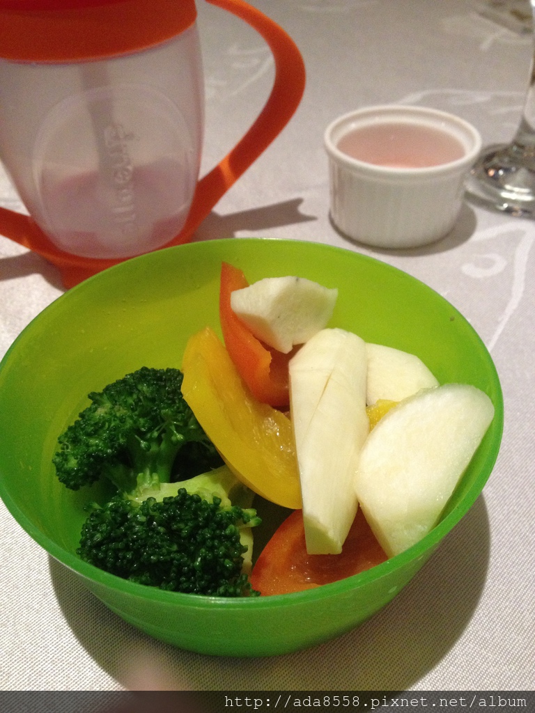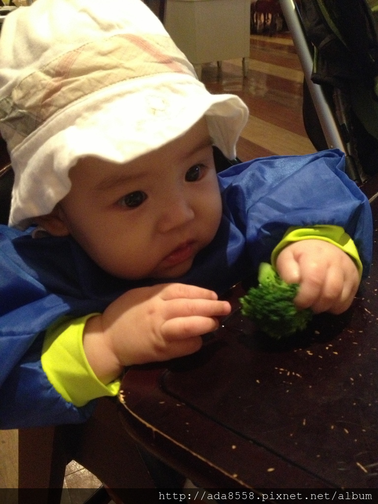 實行BLW後發現台灣的餐廳其實對寶寶是很友善的, 對餐廳提出要求, 通常都會幫忙水煮一些青菜或提供一些水果給寶寶吃 (比在家裡吃的還豐富, 在家媽咪通常都偷懶只煮一兩樣XD)
