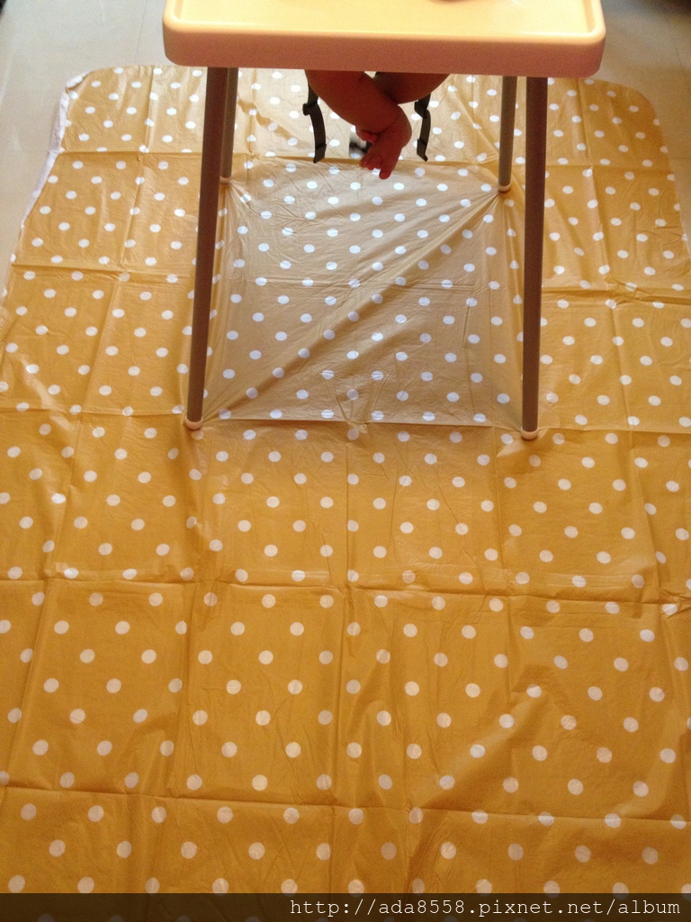 當然啦! 最主要的用餐環境還是家裡, 因為讓寶寶自己吃的代價一定是一團亂, 媽咪除了洗餐具、餐椅、洗小孩還要擦地板, 後來在大創看到這個桌巾就買來舖在地上, 吃完整張拿去浴室隨便沖, 要是用爛了反正39塊丟掉也不心疼!