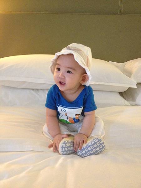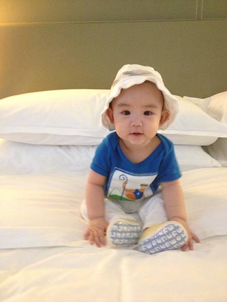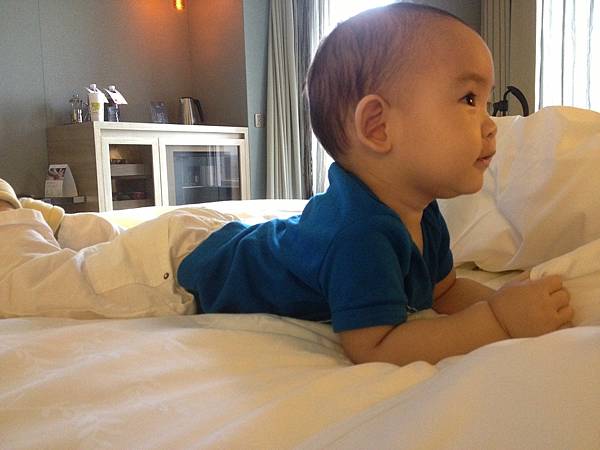 既然游泳池去不成, 頓時突然不知道該做什麼(我們所謂的玩飯店就是沒行程, 輕鬆的享用飯店設施而已), 只好請李董試坐甜夢之床, 恩~看起來很滿意, 笑呵呵!