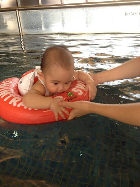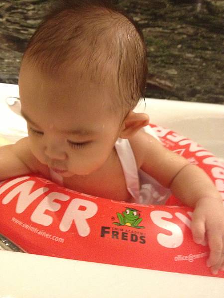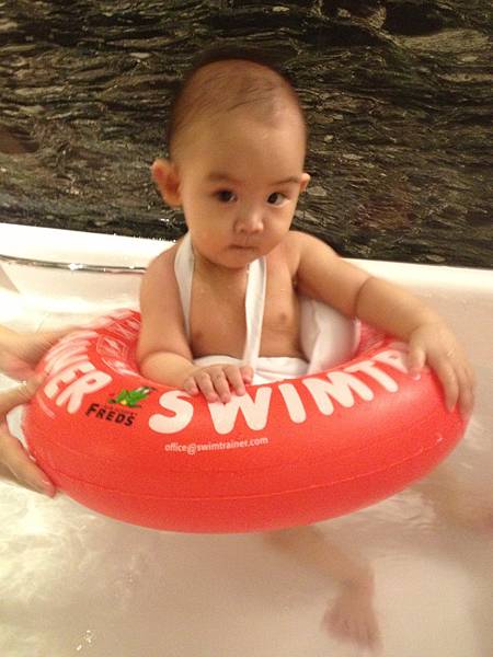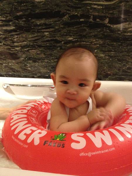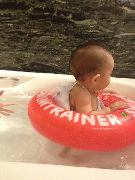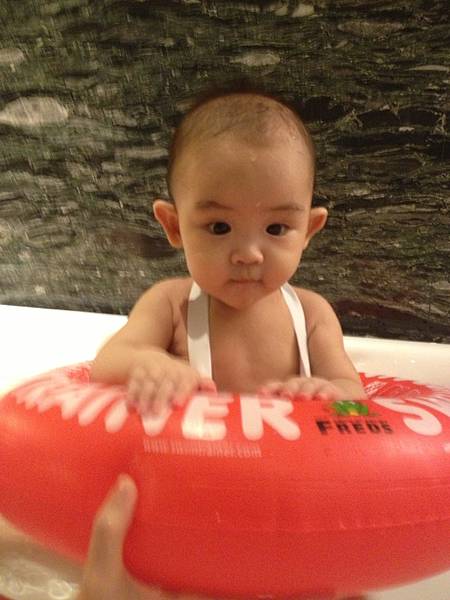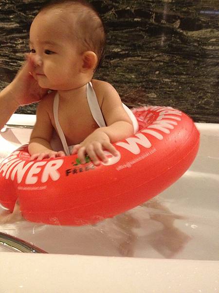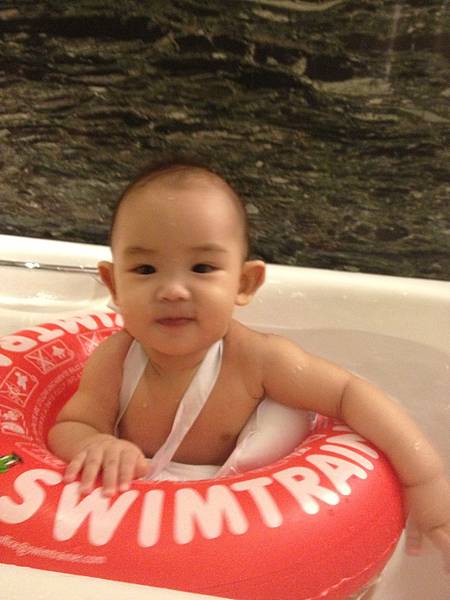 不知道是喜來登的浴缸太淺了? 還是小芋圓長高了? 這次在浴缸游的不是很順利, 因為他腳踩的到底就一直想站著, 沒辦法游呀! 一整個皮樣!