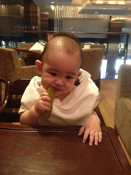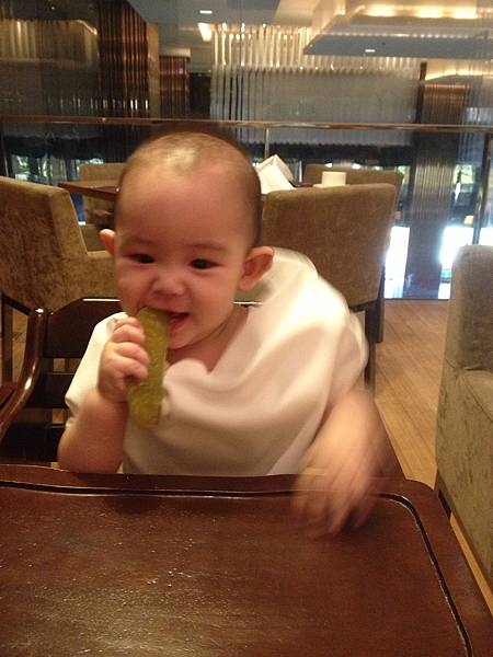 隔天早上享用喜來登豐盛的自助式早餐, 選擇非常多元, 適合小芋圓吃的卻只有楊桃, 好在他非常愛! 啃啃咬咬的也吃掉半根哩!![]()