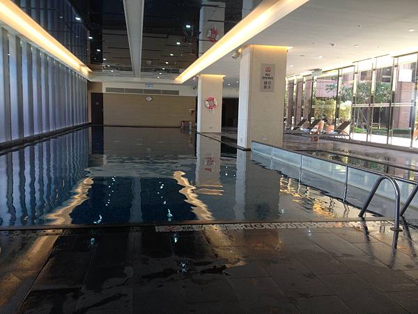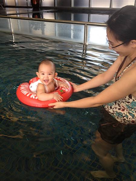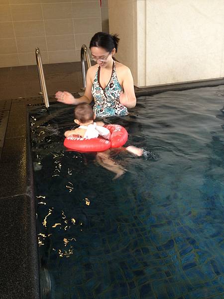 下水後更是整個High到不行呀! 一開始媽咪還不敢放手想說要給他安全感, 沒多久發現他根本不怕, 可以自己游耶! 兒童池雖然在室內, 可是一旁就是大片玻璃落地窗, 採光跟視野都非常好, 寶寶游起來更是享受
