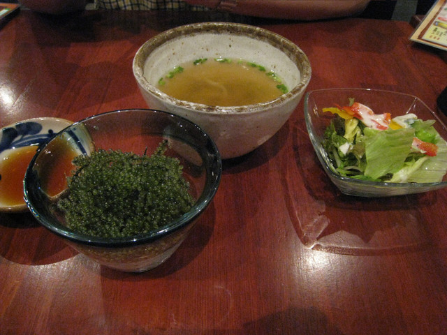 我們一樣點了海葡萄, 沖繩麵, 還點了一份漢堡肉排飯, 但是, 海葡萄沒有恩納村那家"琉球の牛"好吃, 沖繩麵沒有美國村附近的浜屋好吃...